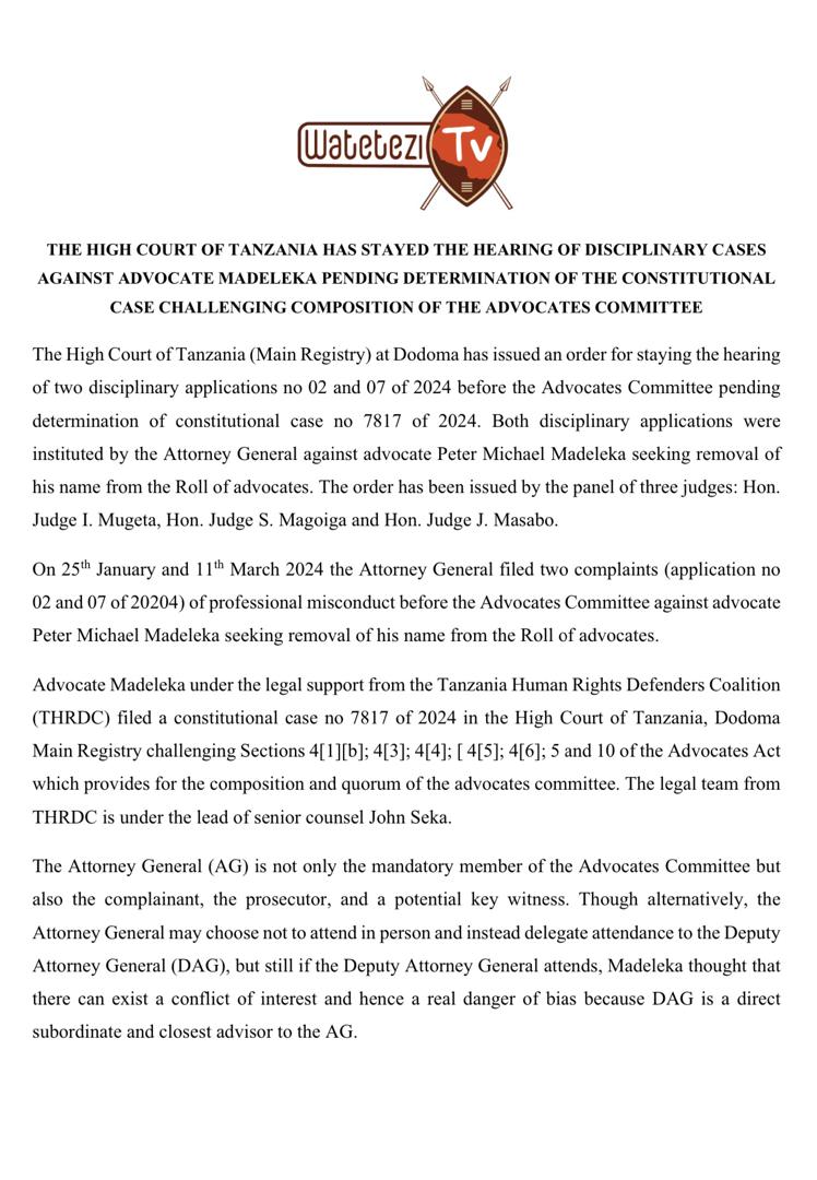 THE HIGH COURT OF TANZANIA HAS STAYED THE HEARING OF DISCIPLINARY CASES AGAINST ADVOCATE MADELEKA PENDING DETERMINATION OF THE CONSTITUTIONAL CASE CHALLENGING COMPOSITION OF THE ADVOCATES COMMITTEE